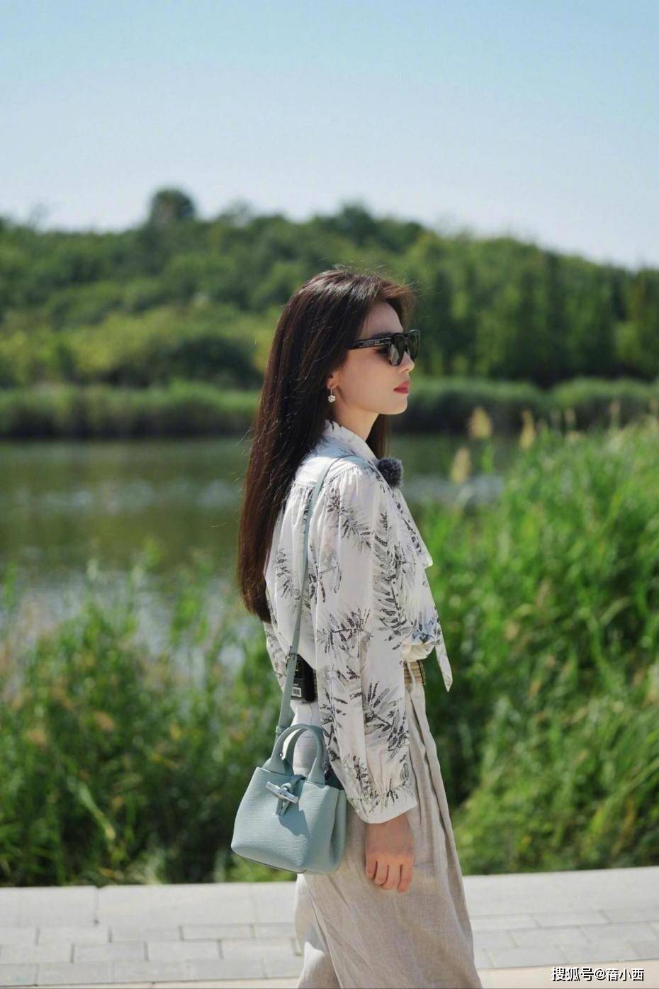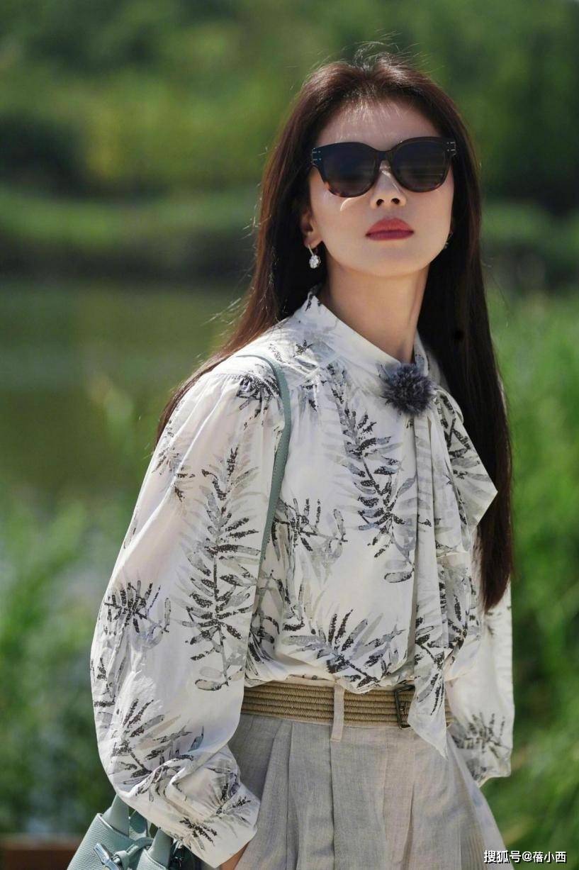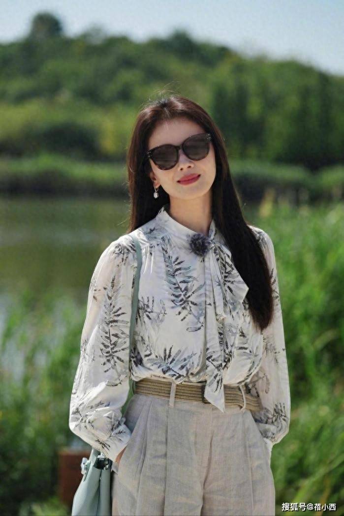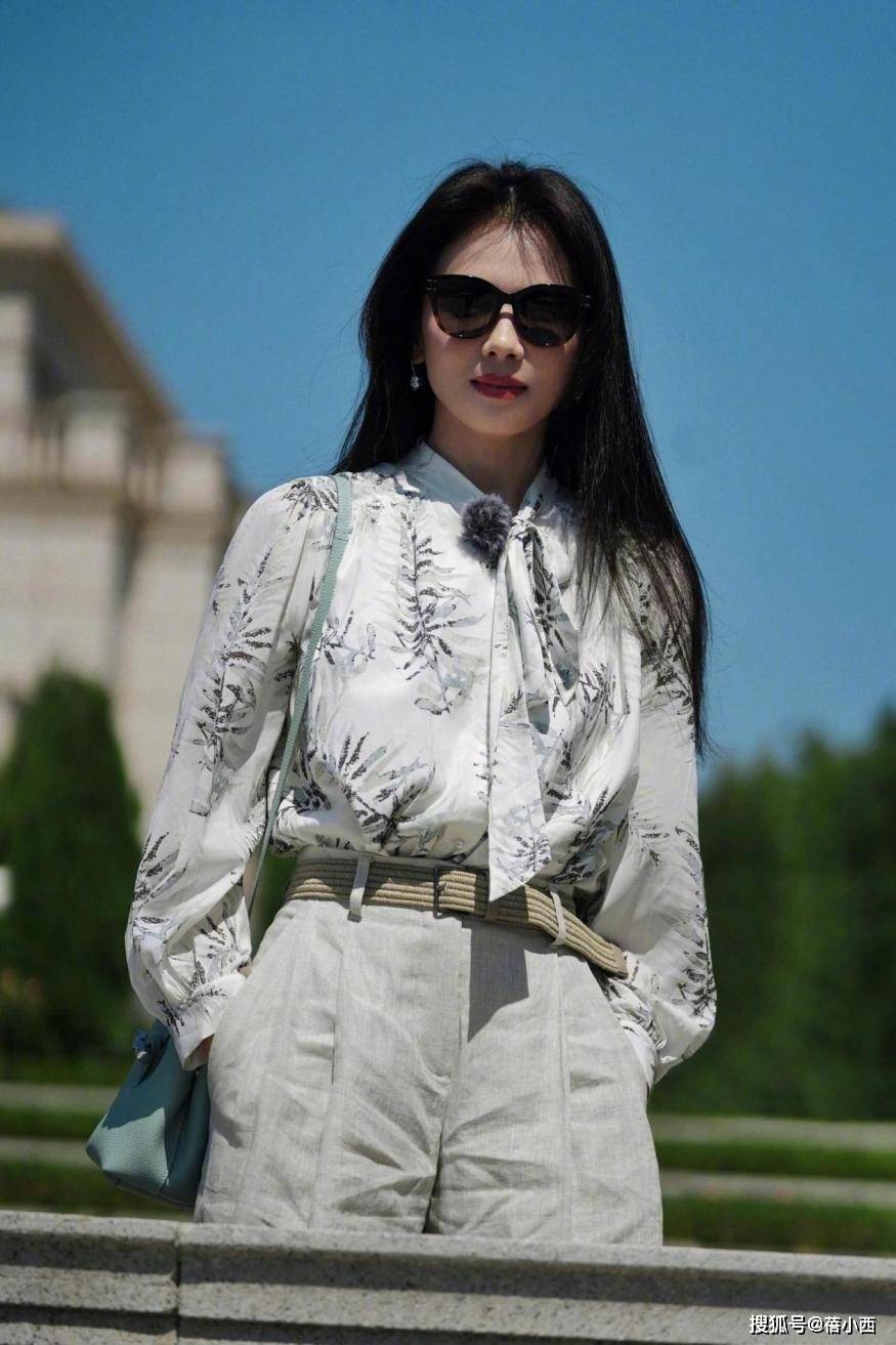 这套造型一出场,就把“春日氛围感”拉满了,刘涛上身一件米白色底的水墨竹叶印花衬衫,瞬间把东方美学穿在了身上。衬衫采用了轻盈的雪纺面料,自带通透的垂坠感,在春日的微风里自带飘逸感,完全不会有闷热感。领口做了精致的系带设计,弱化了衬衫的正式感,又多了几分温柔俏皮,完美中和了水墨印花的清冷感,灯笼袖的设计更是藏肉神器,轻松遮住手臂的拜拜肉,对梨形、苹果型身材都极度友好。