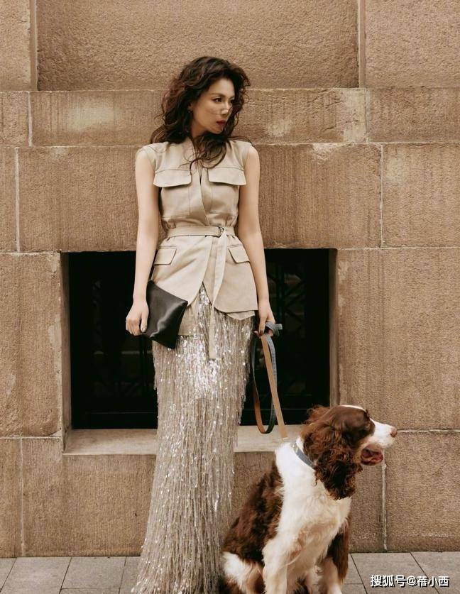 银色亮片流苏半身裙的加入更是绝绝子,整条裙子铺满了细密的银色亮片,行走间流苏随风摆动,自带bling bling的闪光效果,瞬间点亮了整套造型,把女性的浪漫与性感展现得极致。亮片的银色与马甲的卡其色形成完美撞色,既有工装的酷飒,又有亮片的温柔,两种风格碰撞出超强的时尚感,完全不违和。